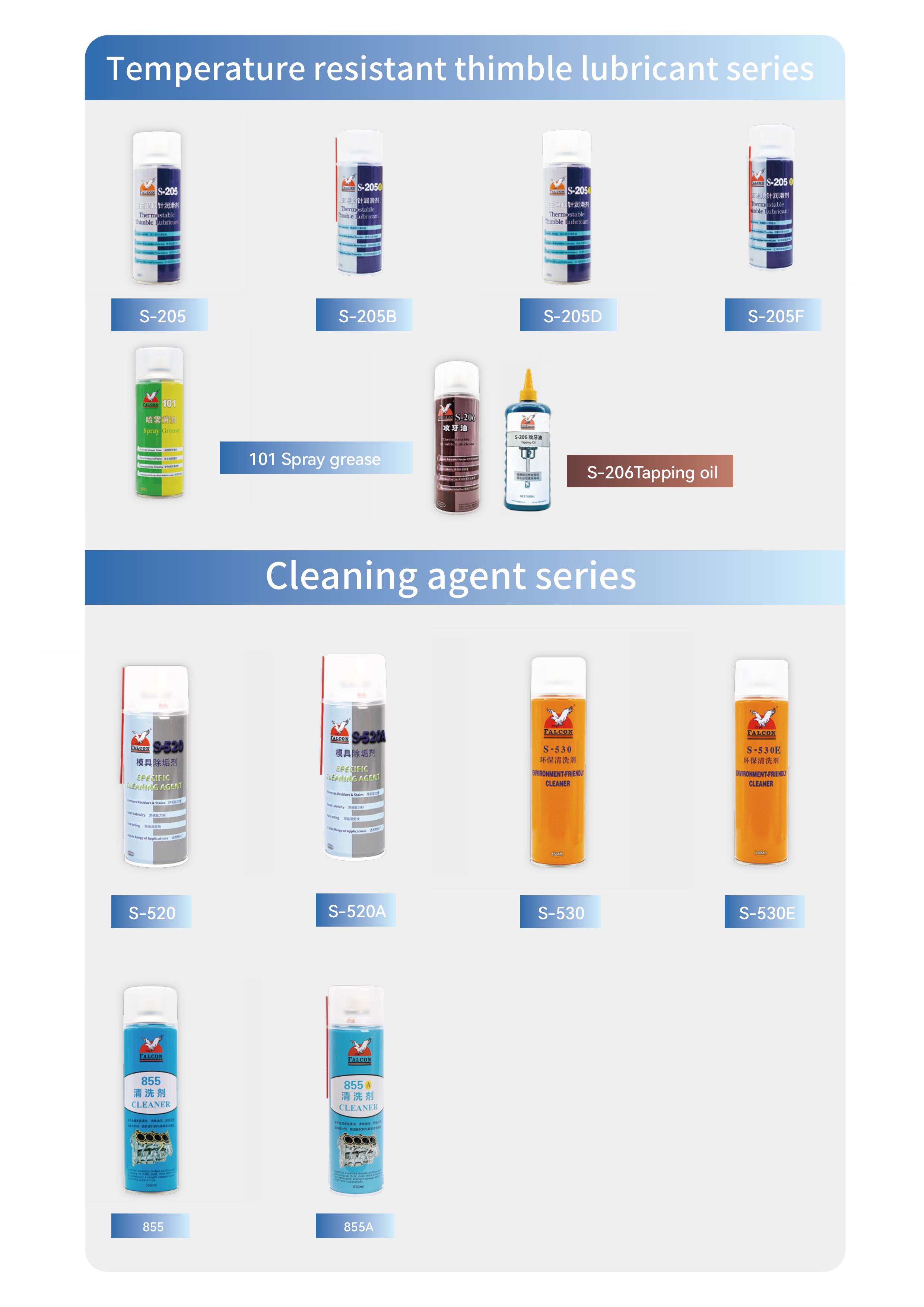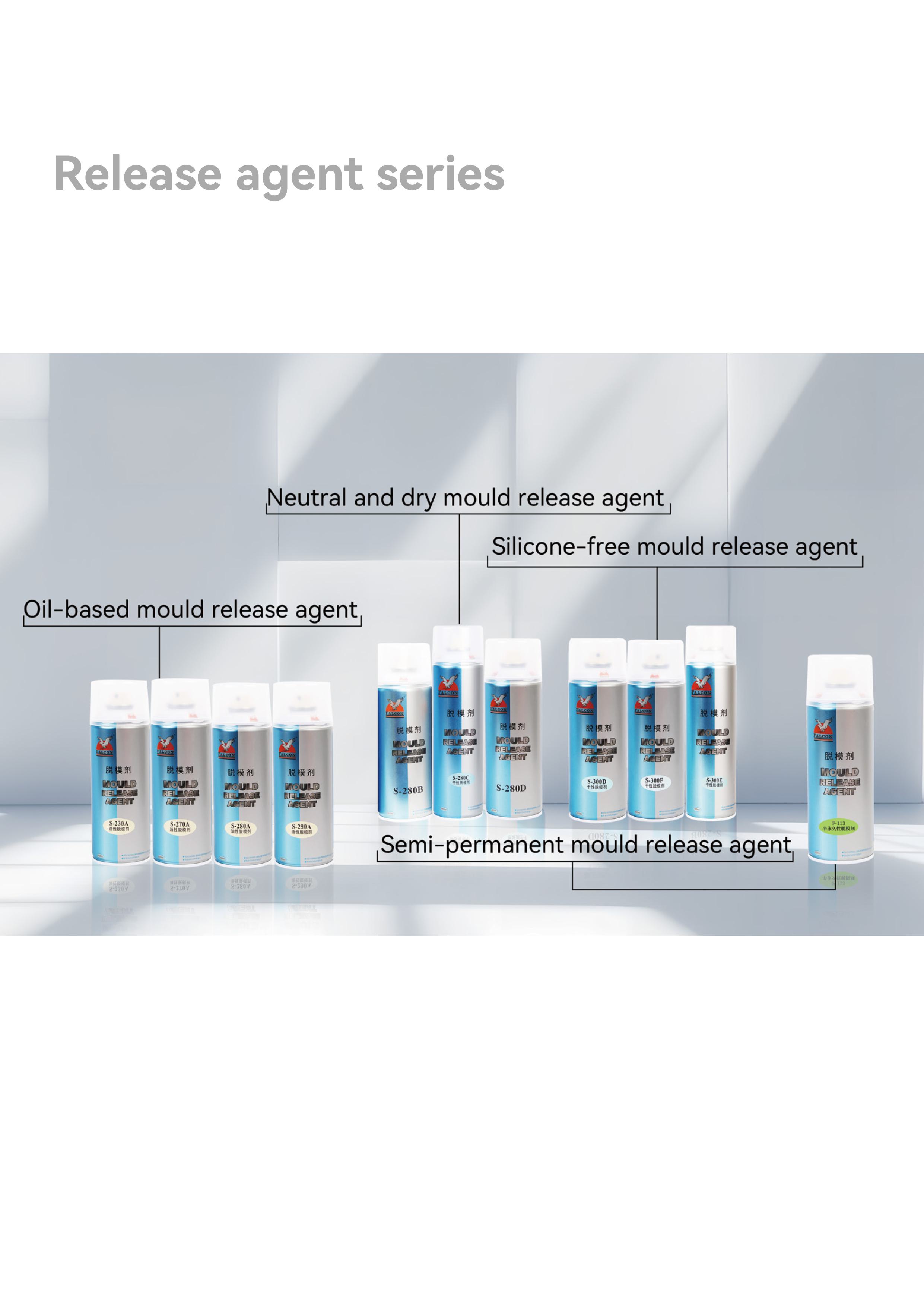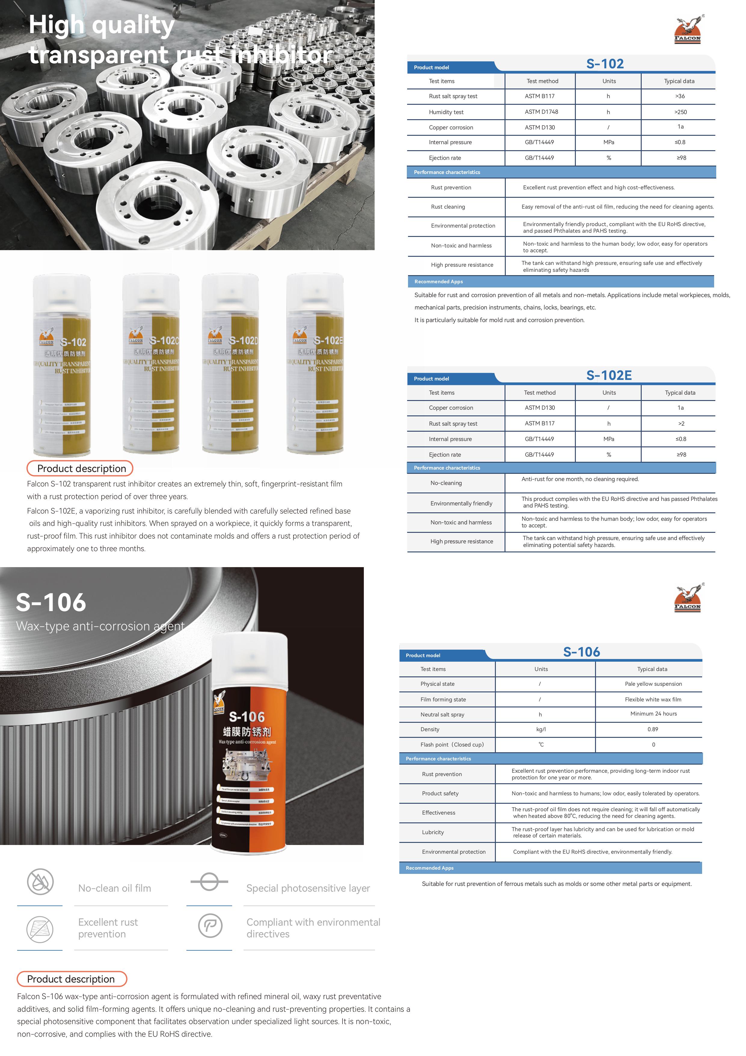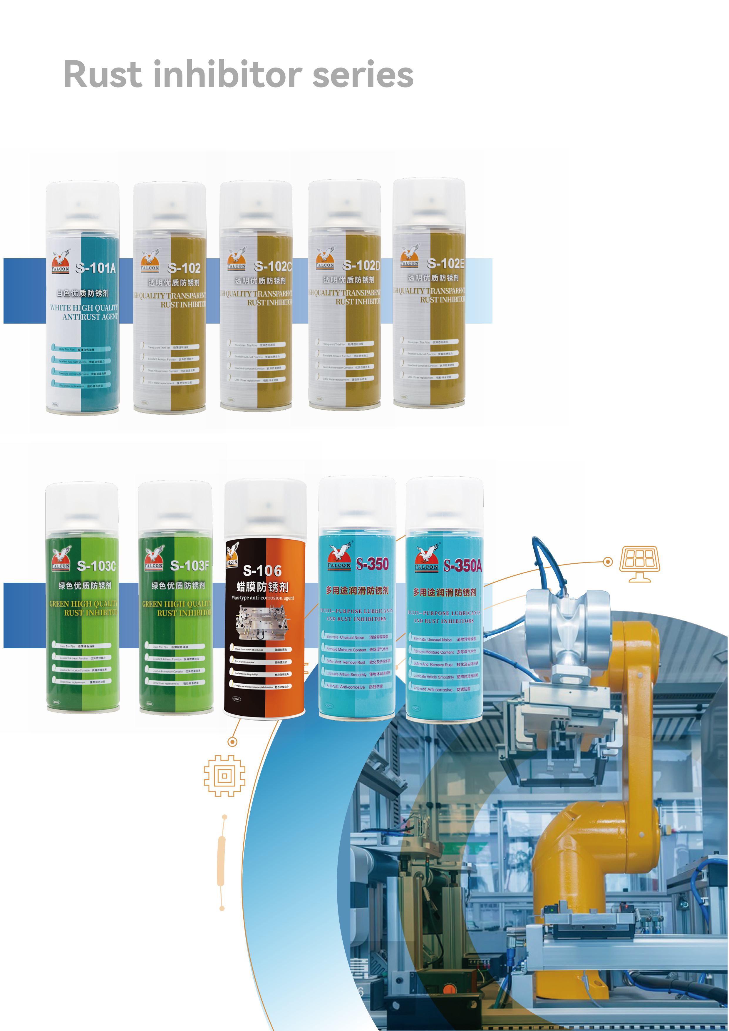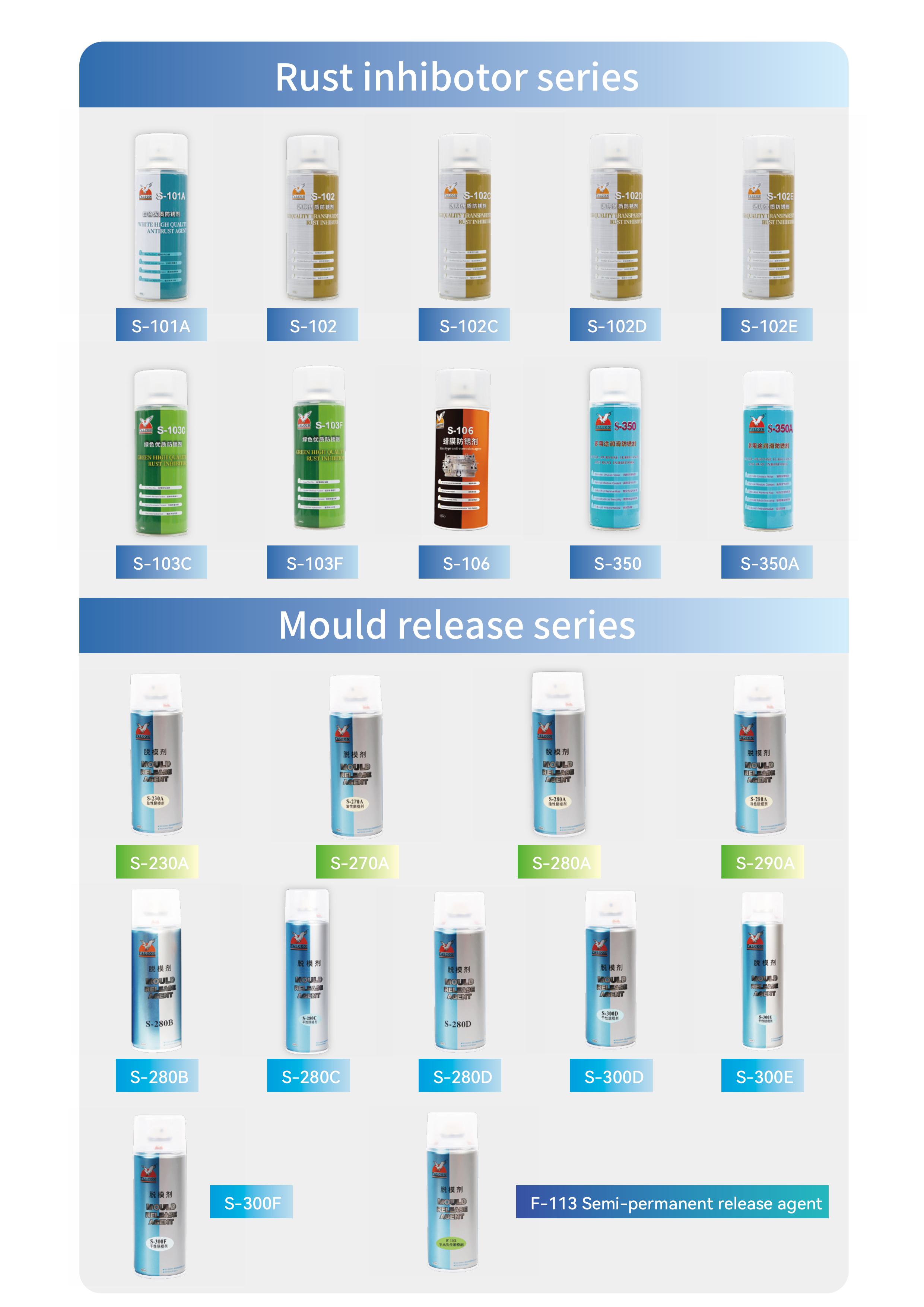This brochure includes product specifications for four main series: Anti-Rust, Mold Release, Lubricating, and Cleaning.