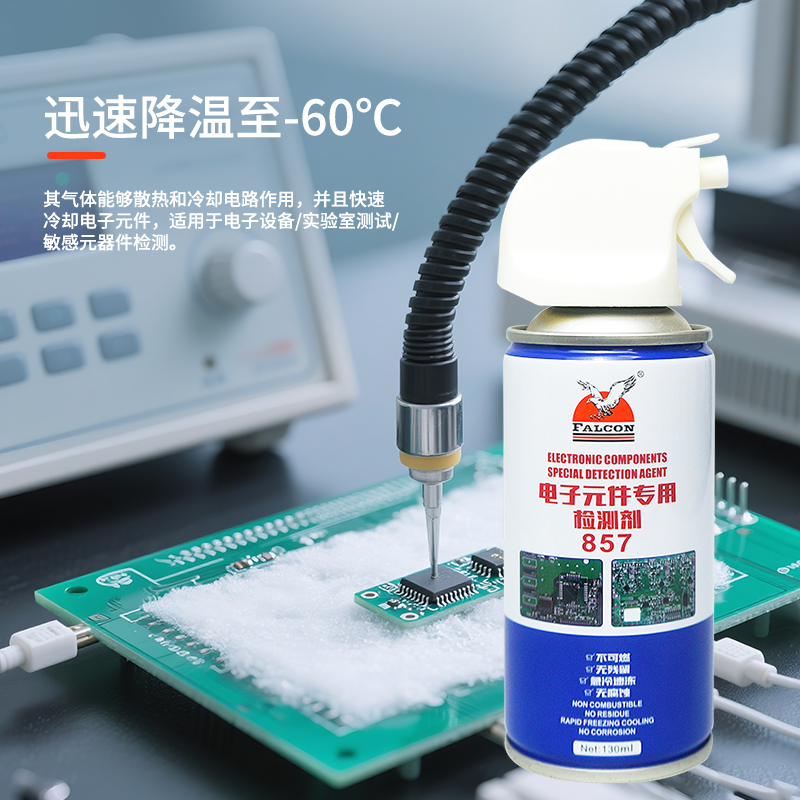 FALCON 857采用环保冷媒配方,可实现对材料表面的瞬时快速降温(最低可达约 -60℃表面温度),并具备良好的挥发性与电气安全性。