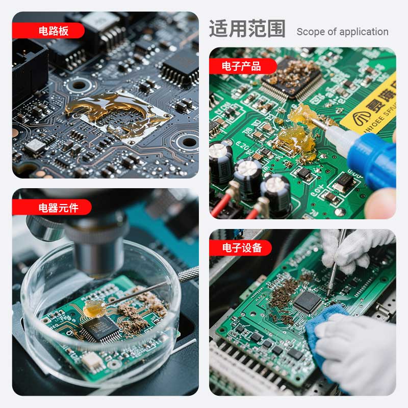 将电路板在产品中浸泡几分钟,然后用软布擦拭,或按平常操作,连续进行三次,即可将渣垢彻底清除干净。