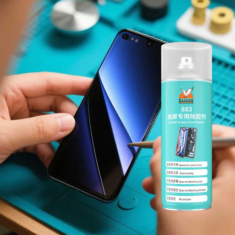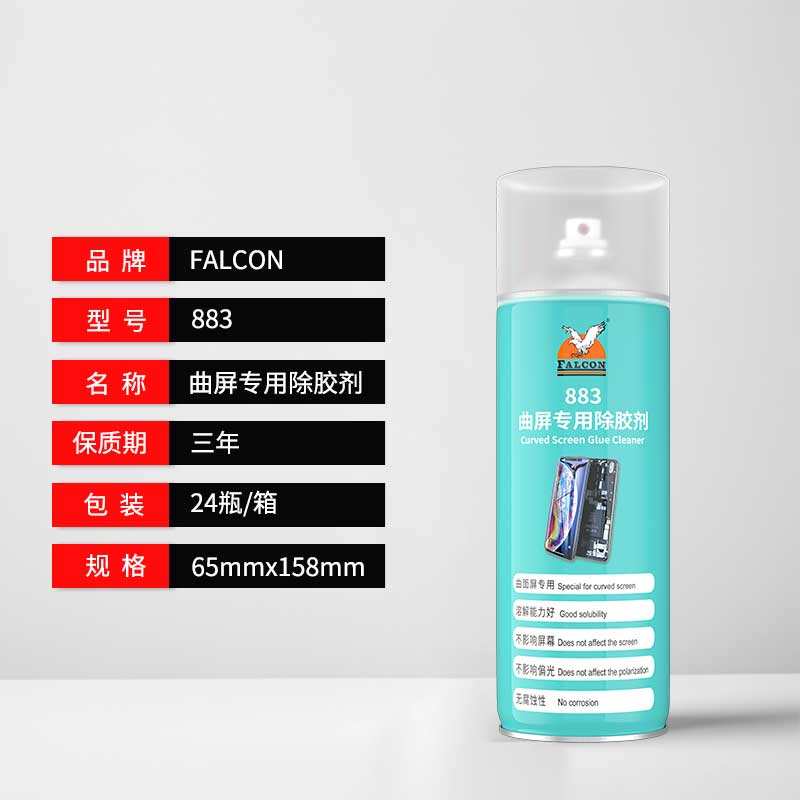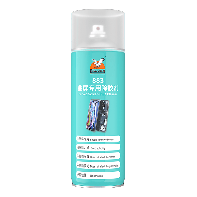 883曲屏专用除胶剂为曲屏返修专用定制;产品含有高精制溶剂,清洗能力强,去胶效果显著,挥发速度快,快速除胶,不伤屏。本品对OCA溶胶,双面胶,不干胶等粘胶具有一喷立除的效果。