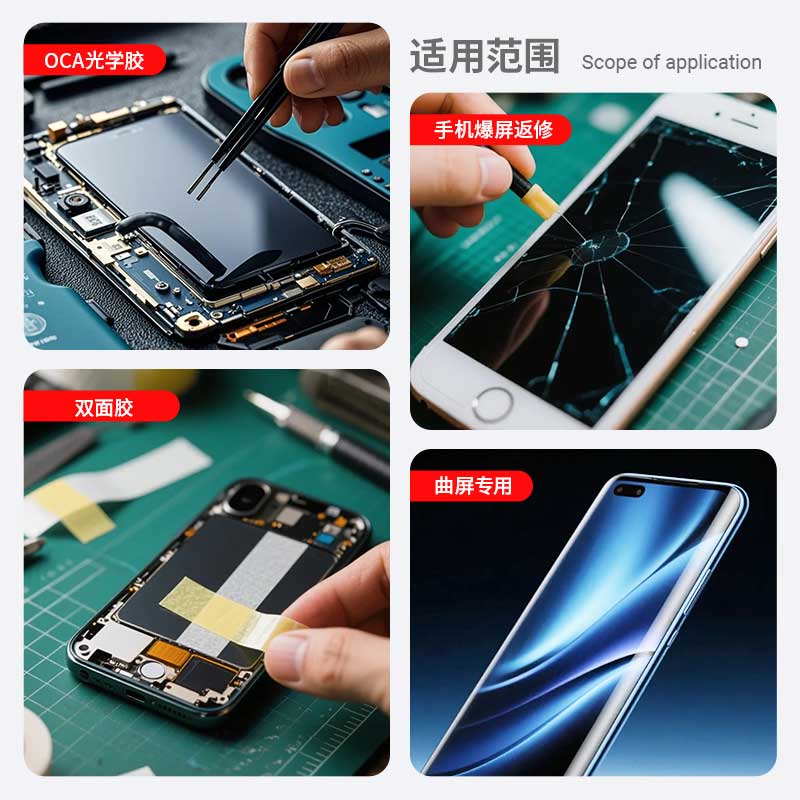 ● 出色的溶解性能,迅速清除OCA溶胶,双面胶,不干胶等粘胶。