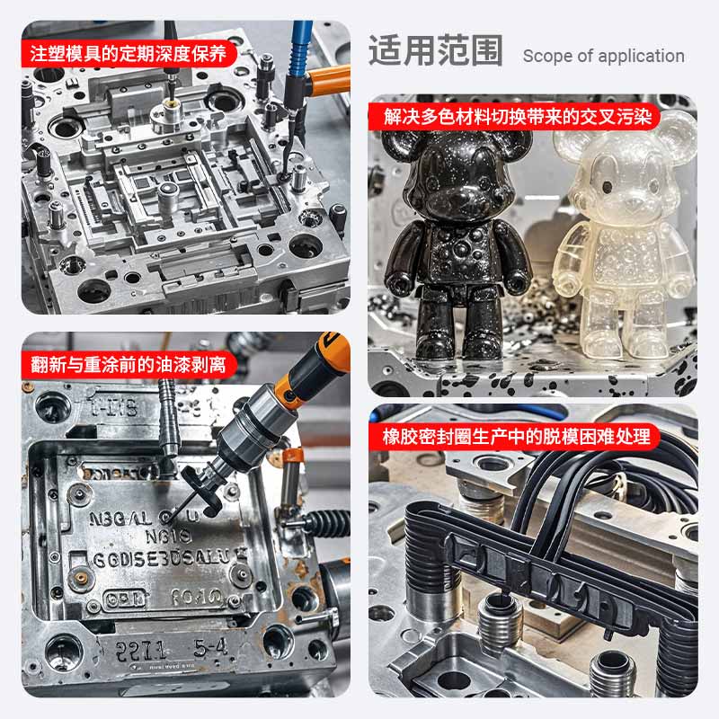 清除模具渣垢时,将本剂对准渣垢喷射后,停留浸泡几分钟,然后用软布擦拭,或按平常操作,连续进行三次,即可将渣垢彻底清除干净。
