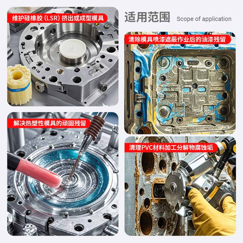 清除模具渣垢时,将本剂对准渣垢喷射,让液体停留浸泡几分钟,然后用软布擦拭,或按平常操作,连续进行三次,即可将渣垢彻底清除干净。