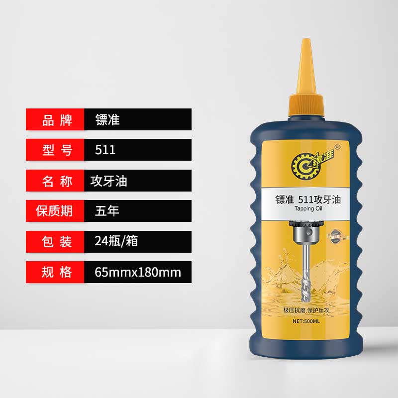 镖准511不锈钢攻牙油是一种含100%活性极压添加剂和防腐蚀添加剂的高浓缩润滑剂,特别适合于难加工金属材料的重负荷切削加工,包括不锈钢及其他高合金钢的钻削,攻丝,铰削等。