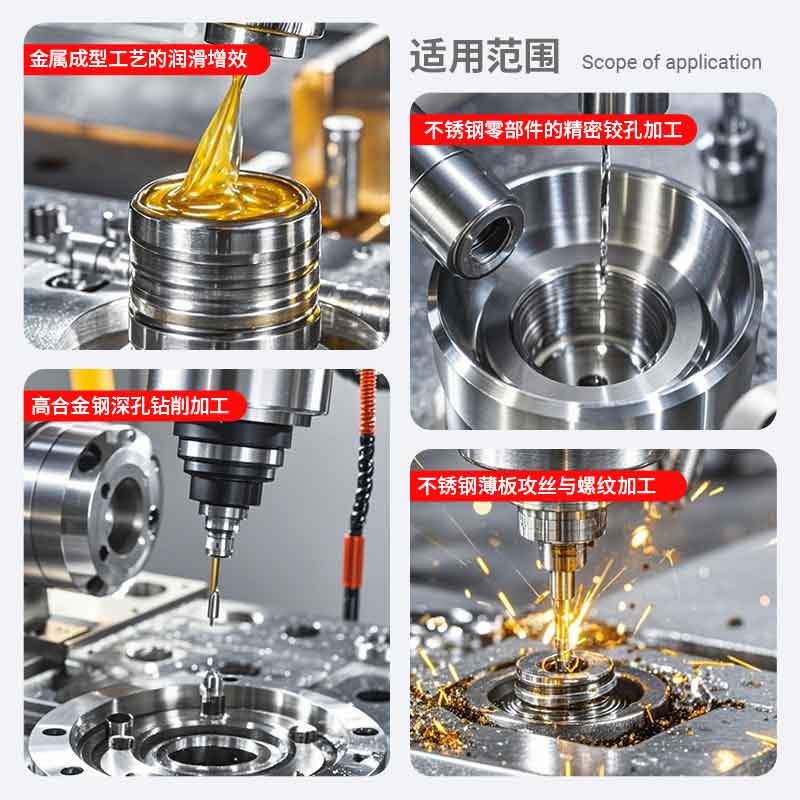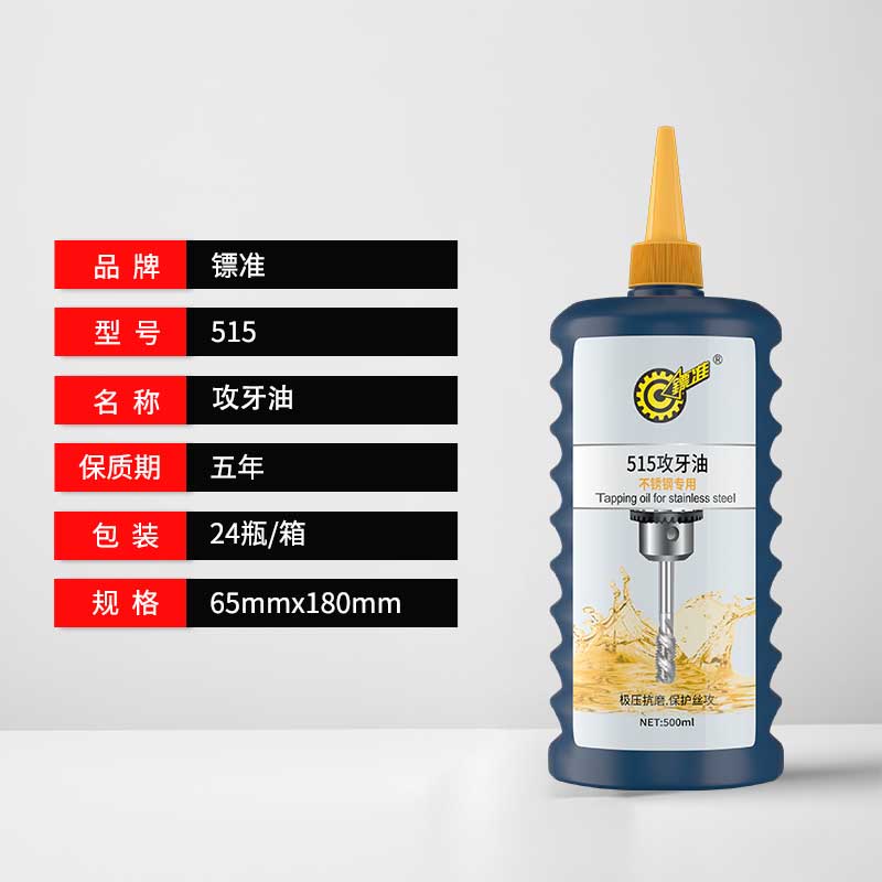 镖准515不锈钢专用攻牙油是一种含100%活性极压添加剂和防腐蚀添加剂的高浓缩润滑剂,特别适合于难加工金属材料的重负荷切削加工,包括不锈钢及其他高合金钢的钻削,攻丝,铰削等。