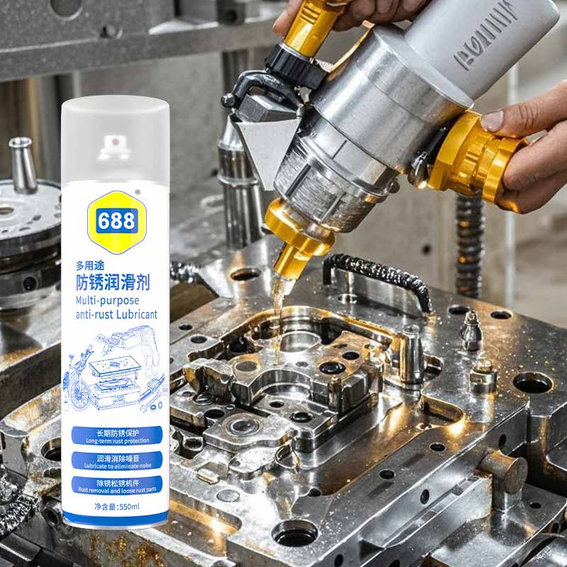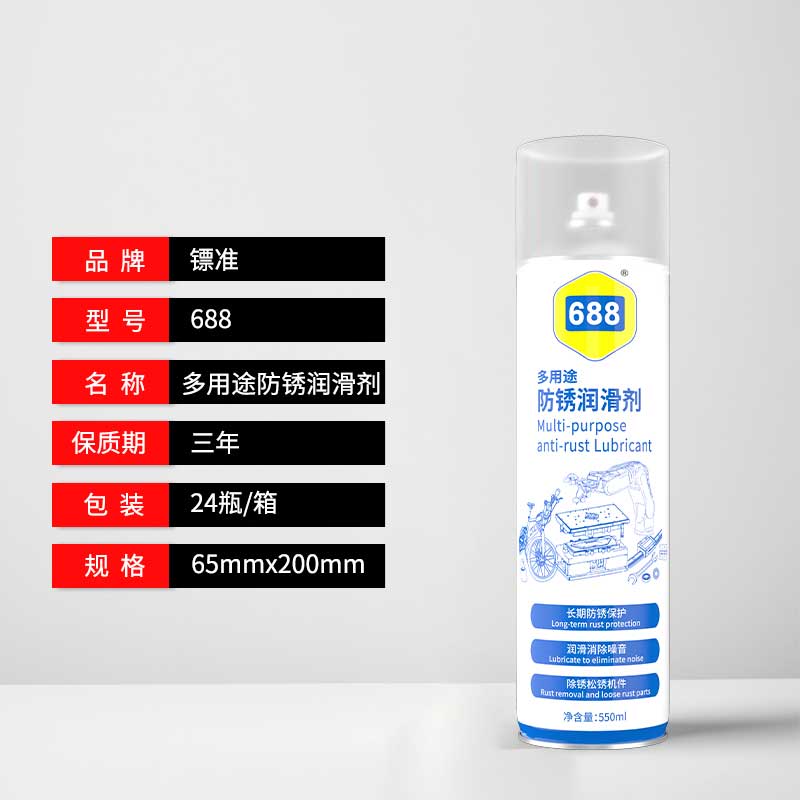 688多用途防锈润滑剂选用精制矿物油、特种防锈添加剂以及高效渗透剂调制而成,产品具有除锈、防锈、润滑、除湿、抗磨、清洁等功能。产品无毒、无腐蚀性,符合欧盟RoHS环保指令, 适合6个月至1年的中短期防锈。