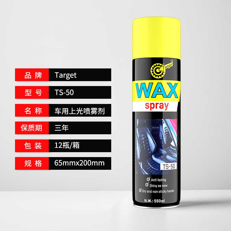 镖准TS-50 车用上光喷雾剂是有特种高光有机蜡与精制溶剂调配而成,能有效的在使用表面形成光膜,不沾灰,不粘手。特含抗老化成分,有效延长皮革织物及塑料制品使用寿命。
